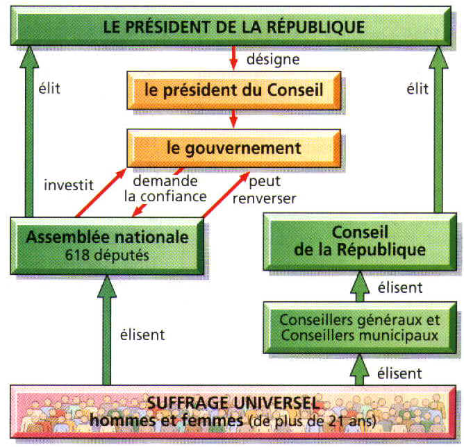 | Remarque Depuis ,1958 cette constitution a été modifiée à plusieurs reprises. Ainsi à partir de 1962 , le Président de la République est élu au suffrage universel, depuis 2002 (référendum en 2000) , le mandat du président dure 5ans. | |