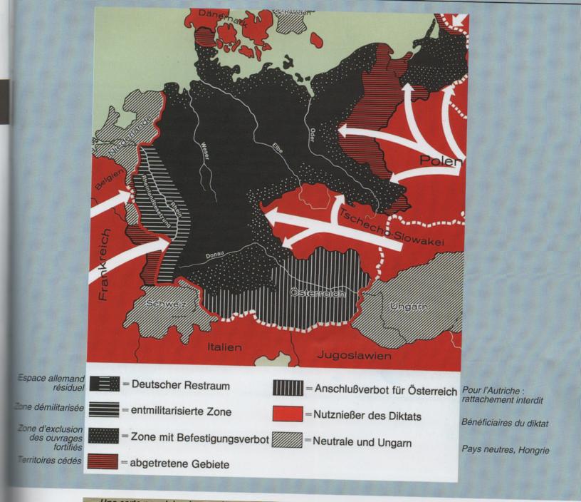 figure comme agressée (flèches) à l’issue du traité de Versailles par une coalition d’Etats (en rouge sur la