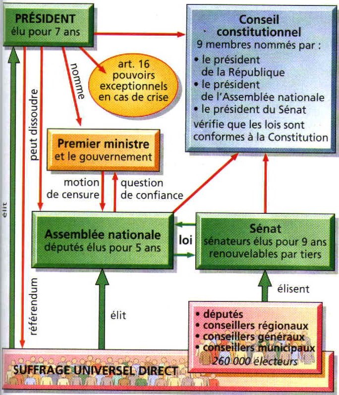 | Remarque Depuis ,1958 cette constitution a été modifiée à plusieurs reprises. Ainsi à partir de 1962 , le Président de la République est élu au suffrage universel, depuis 2002 (référendum en 2001) , le mandat du président dure 5ans. | |
